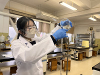 水酸化ナトリウムを使用するため、安全に配慮して保護メガネ、白衣、手袋を着用。